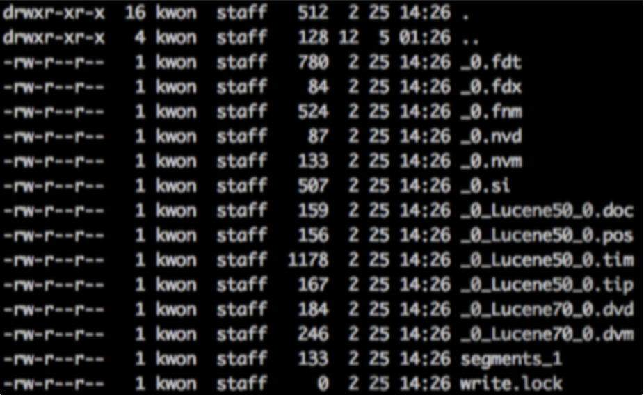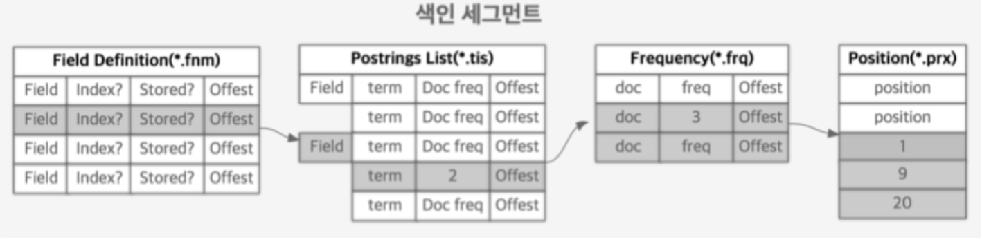 하나의 세그먼트는 여러 개의 파일로 구성된다 세그먼트에는 도큐먼트 필드 뿐만아니라 효과적인 검색에 필요한 다양한 정보가 담겨있다