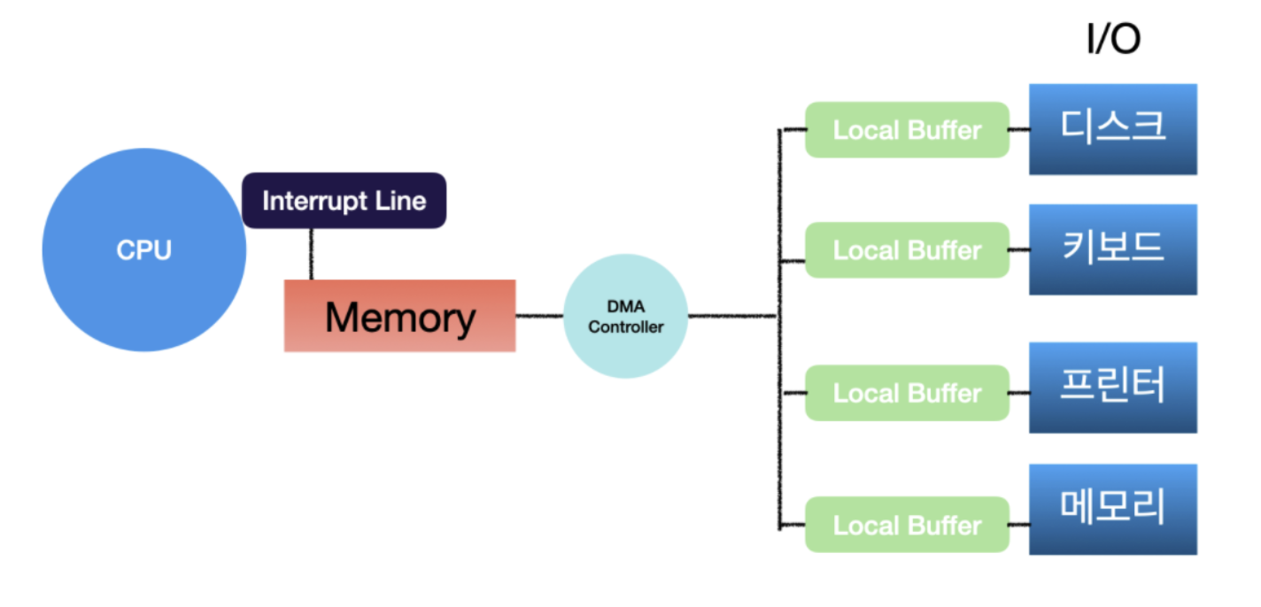 그래서 I/O 장치들은 로컬 버퍼를 가지고 있고 이를 통해 CPU에게 알려주면 CPU가 직접 버퍼에 있는 내용을 자신의 메모리로 카피해서 가져간다
