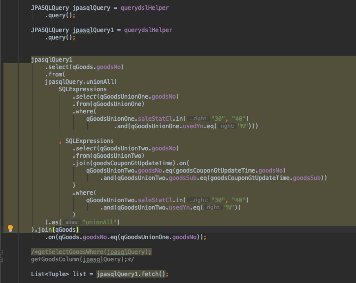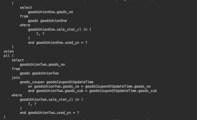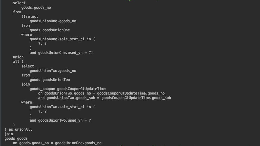 QGoods qGoods = QGoods.goods; QGoods qGoodsUnionOne = new QGoods("goodsUnionOne"); QGoods qGoodsUnionTwo = new QGoods("goodsUnionTwo"); QGoodsCoupon goodsCouponGtUpdateTime = new QGoodsCoupon("goodsCouponGtUpdateTime"); JpaSqlCustomQuery jpasqlCustomQueryUnion = querydslHelper .query(); JpaSqlCustomQuery jpasqlCustomQuery = querydslHelper .query(); jpasqlCustomQuery .from( jpasqlCustomQueryUnion.union( SQLExpressions .select(qGoodsUnionOne.goodsNo) .from(qGoodsUnionOne) .where( qGoodsUnionOne.saleStatCl.in(SaleStatusEnum.SOLDOUT.getCode(), SaleStatusEnum.SALE.getCode()) .and(qGoodsUnionOne.updDm.after(Expressions.dateTemplate(LocalDateTime.class, "{0}", updateDate))) .and(qGoodsUnionOne.usedYn.eq("N"))), SQLExpressions .select(qGoodsUnionTwo.goodsNo) .from(qGoodsUnionTwo) .join(goodsCouponGtUpdateTime).on( qGoodsUnionTwo.goodsNo.eq(goodsCouponGtUpdateTime.goodsNo) .and(qGoodsUnionTwo.goodsSub.eq(goodsCouponGtUpdateTime.goodsSub)) ) .where( qGoodsUnionTwo.saleStatCl.in(SaleStatusEnum.SOLDOUT.getCode(), SaleStatusEnum.SALE.getCode()) .and(goodsCouponGtUpdateTime.ut.after(Expressions.dateTemplate(LocalDateTime.class, "{0}", updateDate))) .and(qGoodsUnionTwo.usedYn.eq("N")) ) ).as("goodsUnionOne") ).join(qGoods) .on(qGoods.goodsNo.eq(qGoodsUnionOne.goodsNo)); getSelectGoodsWhere(jpasqlCustomQuery, updateDate); getGoodsColumn(jpasqlCustomQuery);그리고 실행을 해보았다!! 두근두근두근